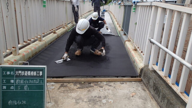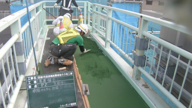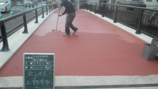 | 可撓性(かとうせい)が大きいので下地舗装に追随します。たわみの大きい歩道橋の橋面でよく使用されるエポキシ樹脂モルタルのカラー舗装材です。