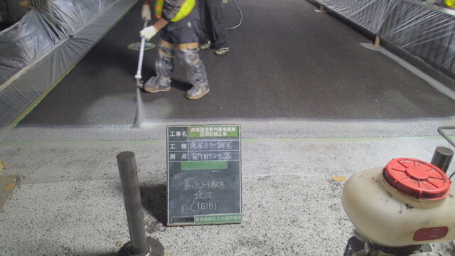 | 排水性トップコート工法は、排水性舗装の表面に特殊な樹脂(メタクリル樹脂等)を散布し、強靭な樹脂皮膜を形成して、耐久性を向上させる薄層カラー舗装工です。 |